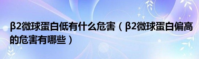 -微球蛋白是一种小分子蛋白质。无论是血还是尿中高,对人体基本无害,主要是作为反映患者性功能的指标而存在。-微球蛋白是一种小分子蛋白质,可以从肾小球中自由滤过,肾小球滤过后会被肾小管重吸收。但这种重吸收一般不会重吸收到血液中,而是在肾小管上皮细胞中降解。血2微球蛋白和尿2微球蛋白升高代表不同的意义,常见的情况如下: