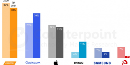 尽管市场份额从37%下降至33%,但联发科仍然位居榜首。分析师解释说,智能手机供应商为了防止芯片短缺而囤积了额外的设备。事实证明,供应足够稳定,而且他们的供应超出了他们的需求,因此第四季度的出货量有所下降。