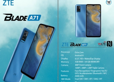 继续前进,有一个三重后置摄像头,由一个16MP(主)+8MP(超宽)+2MP(深度)传感器组成。前置摄像头是一个可观的8MP,除此之外,您还可以在里面找到一个4000mAh的电池组。BladeA71也提供NFC和VoLTE连接。