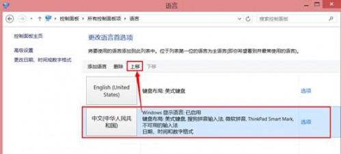 2. 在语言窗口中将“中文(中华人民共和国)”上移到第一位,选择“中文(中华人民共和国)”点击“上移”;