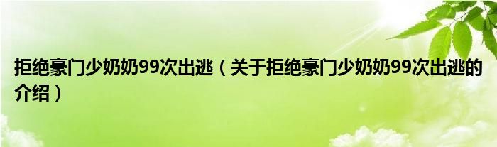 大家好,小都来为大家解答以上的问题。拒绝豪门少奶奶99次出逃,关于拒绝豪门少奶奶99次出逃的介绍很多人还不知道,现在让我们一起来看看吧!
