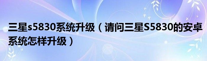 2,三星s5830的手机系统怎么升级:三星s5830使用的是安卓系统。安卓手机升级系统/固件操作方法有如下三种:一丶Fota方式升级:通过手机设定-(一般)-关于设备-系统更新(或软件更新)-更新。此方式升级固件注意事项:1).手机需设置为当前时间2).建议升级时手机有足够的电量最好多于50%。3).手机需要有足够的存储空间(至少1GB USB存储器)。4).网络环境稳定(系统/固件更新版本较大,可能会消耗较多流量,建议升级时可以使用WLAN上网方式操作)。二丶Kies方式升级:在电脑中安装Kies软件,安装后手机和电脑通过USB连接,打开Kies软件,如有手机系统/固件新版本时Kies软件会有固件升级提示,点击升级即可。1).Kies下载链接如下:http://www.samsung.com/cn/support/usefulsoftware/KIES/JSP注意:下载安装时手机与电脑不要连接。若使用的手机或平板电脑采用的是安卓4.3及以上操作系统,请下载安装Kies3版本。2).Kies方式升级固件注意事项:http://skp.samsungcsportal.com/integrated/popup/FaqDetailPopup3.jsp?cdsite=cn&seq=438936三丶送到三星服务中心升级:携带购机发票、包修卡和机器到三星服务中心,由专业的售后工程师帮助升级。