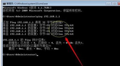 3、在如下图所示的管理员命令窗口中输入如下命令语句:ping 192.168.0.1。也可以使用ping 192.168.1.1来替代。接着使用回车键来执行该命令语句。如下图所示,若是平均速度小于5,那么就是正常的。